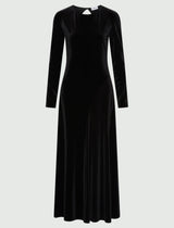 Prepararsi per una serata speciale è facile, con questo abito in velluto stretch: aderente sul busto e svasato sulla gonna, svela un grande oblò sulla schiena, per un nude look sensuale.