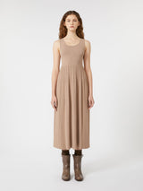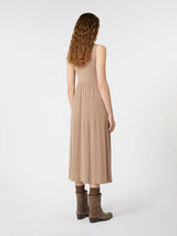 Abito lungo smanicato, la lavorazione a coste con gonna a plissè evidenzia la silhouette femminile.