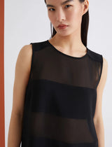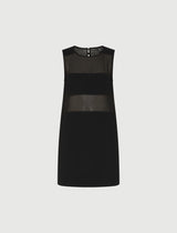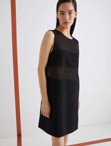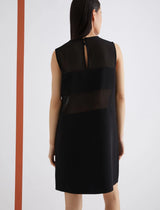 Essenziale nelle linee, sofisticato nei materiali: nuovo abito smanicato in envers satin, con pannelli orizzontali in georgette che creano un gioco sensuale di trasparenze sul busto.
