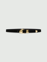 Look deciso e dettagli dorati definiscono questa cintura in suede: la fibbia con linea asimmetrica è completata da passante, vele e puntale in metallo per una nota grintosa.