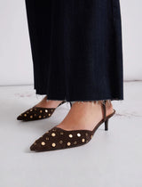 La forma più trendy del momento, con l'aggiunta delle borchie dorate: questa è la slingback più amata, con tacco sottile e il giusto tono rock chic.