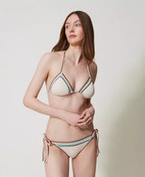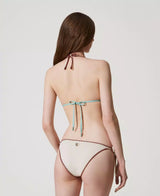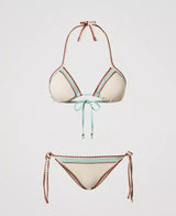 Bikinicomposto da triangolo da bagno e tanga con ricamo a punto bambola, inserto a contrasto e ricamo crochet in trasparenza. Il triangolo è imbottito con coppe estraibili e ha laccetti da annodare dietro al collo o da indossare come spalline grazie alle asole presenti alle estremità, chiusura a fiocco sul retro. Il tanga ha i laccetti regolabili ai fianchi rifiniti al fondo da anelli dorati e il logo a cuore in metallo sul retro.