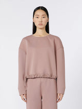 Felpa boxy realizzata in morbido jersey accoppiato di cotone, con scollo rotondo con pinces e maniche lunghe a giro basso. Impreziosita dalla coulisse in taffettà al fondo, ha una seconda coulisse interna a regolare il volume. Zip sul retro del collo.