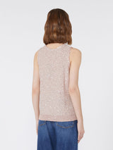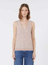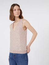 Top smanicato impreziosito da un ricamo di paillette all over.