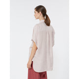 Camicia dalla linea ampia, caratterizzata da colletto modello polo chiuso da 3 bottoni a vista.