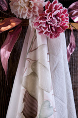 Il set include 1 canovaccio in spugna assorbente e 1 canovaccio in cotone leggero, entrambi decorati con eleganti foglie e fiori nei toni del verde salvia, rosa antico e beige.