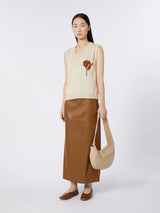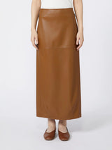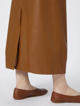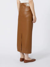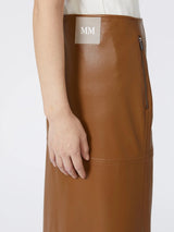 Gonna in jersey con texture effetto nappa, rifinita con impunture a binario. Tasche con zip inserite nei fianchi, spacco sul retro. Il gioco di tagli definisce la silhouette, insieme ai dettagli di pinces che donano una linea chiusa al fondo. Linea pencil.