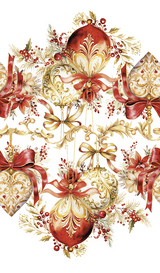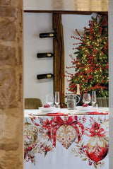 Celebra un Natale sontuoso e raffinato con questa magnifica tovaglia antimacchia dal design opulento. Grandi decorazioni natalizie illustrate ad acquerello dominano il tessuto: palline rosse e oro con decorazioni barocche, fiocchi di raso rosso lucido, stelle di Natale dorate, bacche rosse e composizioni floreali creano un'atmosfera di lusso e celebrazione.