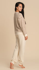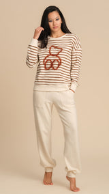 Rendi unico il tuo look da casa con questo completo donna in misto cotone, morbido, caldo e perfetto per l’homewear nella stagione autunno-inverno. Il tessuto di qualità garantisce comfort e una sensazione piacevole sulla pelle, ideale per il relax quotidiano. La maglia a maniche lunghe presenta righe sottili ed un adorabile orso ricamato con filo lurex, che aggiunge un dettaglio luminoso e originale. Il pantalone lungo color panna, dal taglio morbido con polsino alla caviglia, completa il completo donando uno stile casual ma curato. Un capo versatile che unisce comodità e stile, perfetto per trascorrere le giornate in casa con un tocco di femminilità e calore.