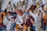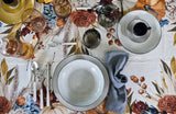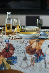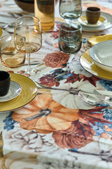 Questa tovaglia non è solo un elemento funzionale, ma una vera opera d'arte per la tavola. Il mix di zucche ornamentali, fiori e elementi botanici crea una composizione equilibrata e sofisticata che valorizza ogni mise en place autunnale.