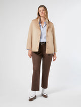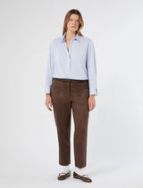 Confortevoli e attuali i pantaloni in jersey effetto scamosciato, dalla linea slim. Sono rifiniti a taglio vivo al fondo.
